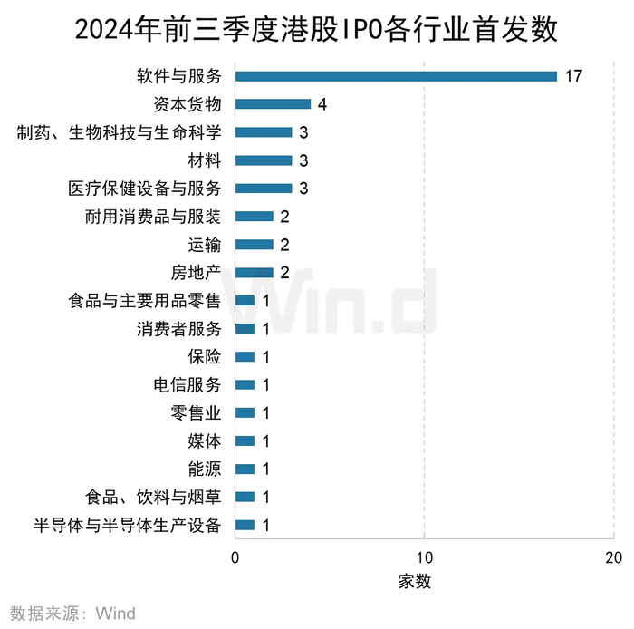 从各行业IPO发行数量来看,软件与服务行业共有17家企业IPO,位列第一;资本货物行业有4家企业IPO,位列第二;生物制药、材料以及医疗保健设备与服务行业各有3家企业IPO,并列第三。