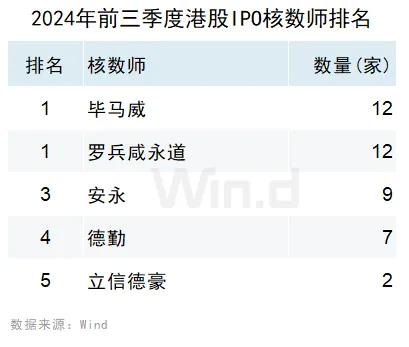 毕马威与罗兵咸永道各参与了12家IPO,并列核数师排名中的首位;安永参与了9家IPO,位列第三。