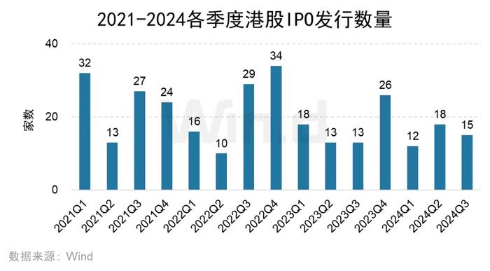 2024年前三季度港股IPO发行数量为45家,较去年同期的44家增加2.27%。