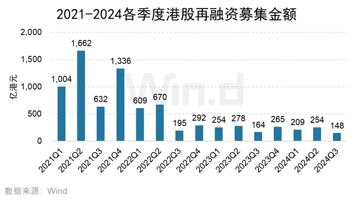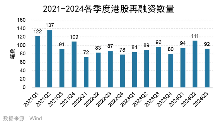 2024年前三季度,再融资募集总额为611亿港元,较去年同期的696亿港元略减12.34%。再融资项目数量为297起,较去年同期的269起略增10.41%。