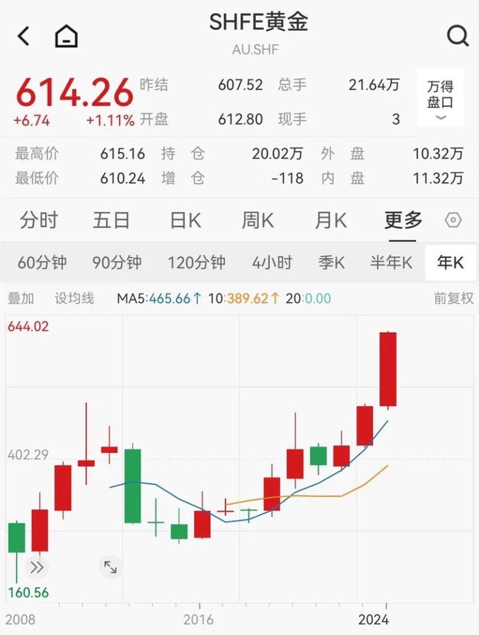 国内金价亦走势强劲。10月17日,沪金(SHFE黄金)主力合约同步走高,再创历史新高,最高涨至615.16元/克,年内累计涨幅已超25%。