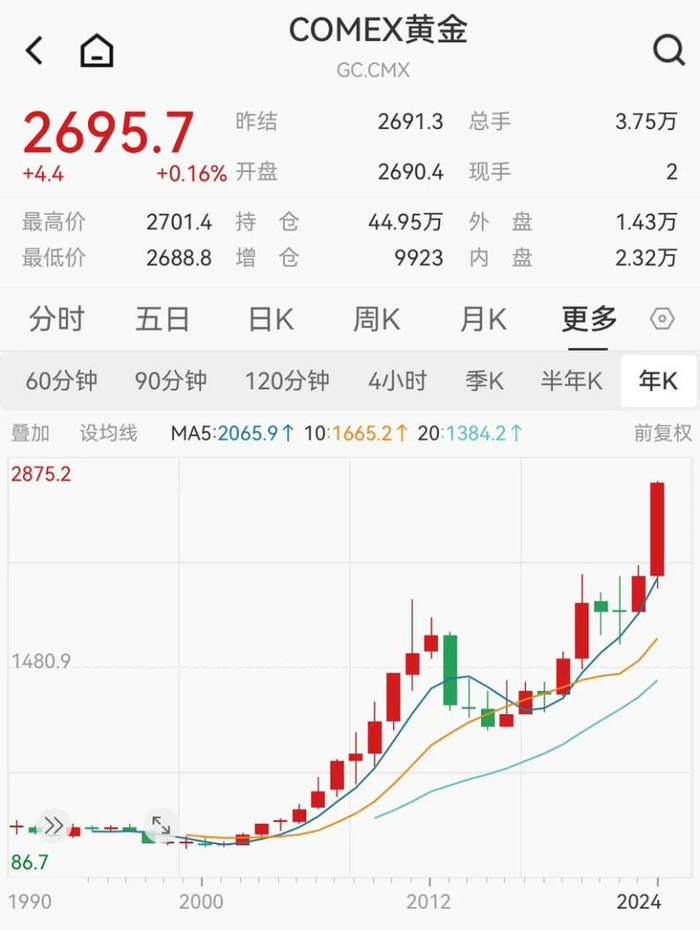 今年以来,国际金价持续走强,走出一波主升行情。10月17日,国际金价再度刷新历史新高,伦敦金现盘中突破于9月创下的前高2685.58美元,最高涨至2685.73美元/盎司。COMEX黄金日内最高涨至2701.4美元/盎司,已连续两日冲击2700美元关口。截至发稿,伦敦金现、COMEX黄金年内累计涨幅均已达30%。