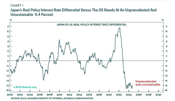 这是一个什么概念呢?自2022年以来,日本相对于美国的实际政策利率差已发生了-12个百分点的显著变化。全球两个主要经济体之间的实际政策利率差异,在如此短的时间内发生如此大的转变,是前所未有的。