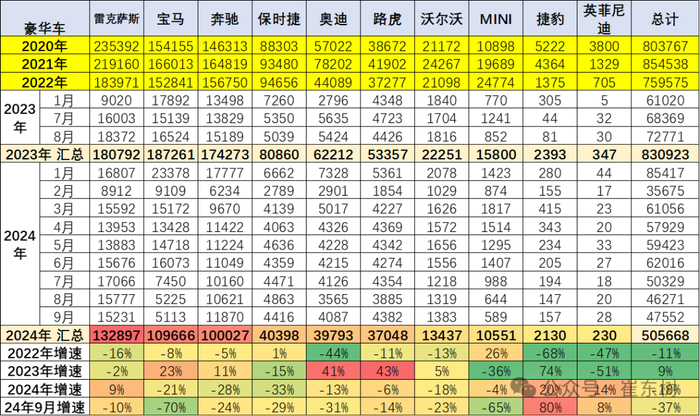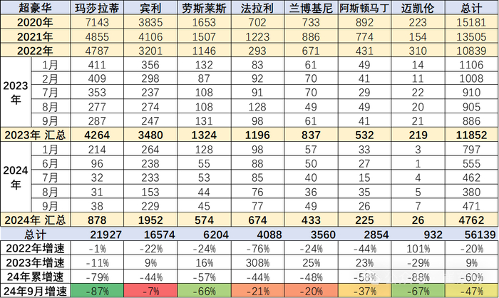 过去几年进口超豪华车持续下降,但2023年以来出现9%的增长,2024年1-9月加速下滑。宾利和劳斯莱斯的走势总体低迷,超豪华总体走弱体现超高端消费群体的购买力暂时放缓,或者是转到的国产高端。