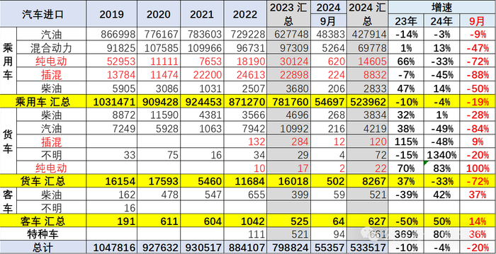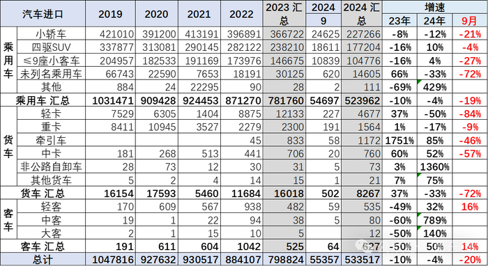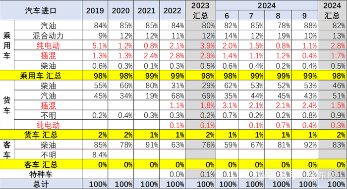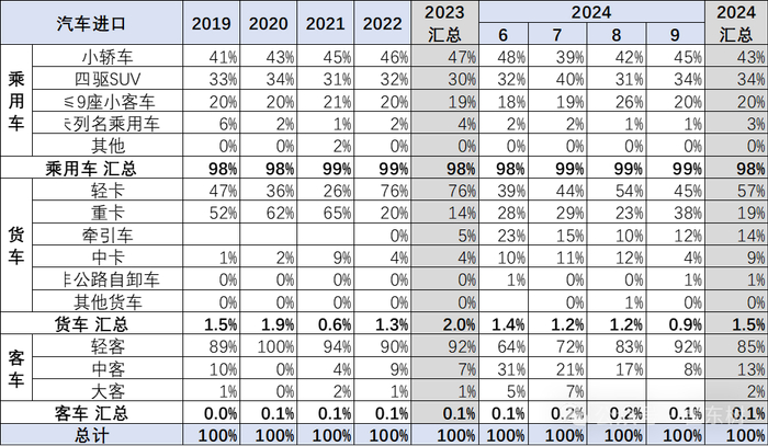 今年汽车进口结构中的乘用车占到98%的绝对主力地位,其中2024年1-9月进口轿车22.7万台、占比43%,进口四驱SUV进口18万台、占比34%,而新能源车的未列名机动车进口1.5万台、占比3.4%。
