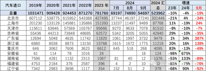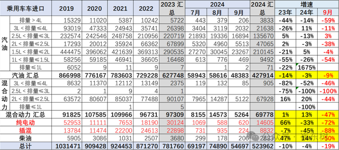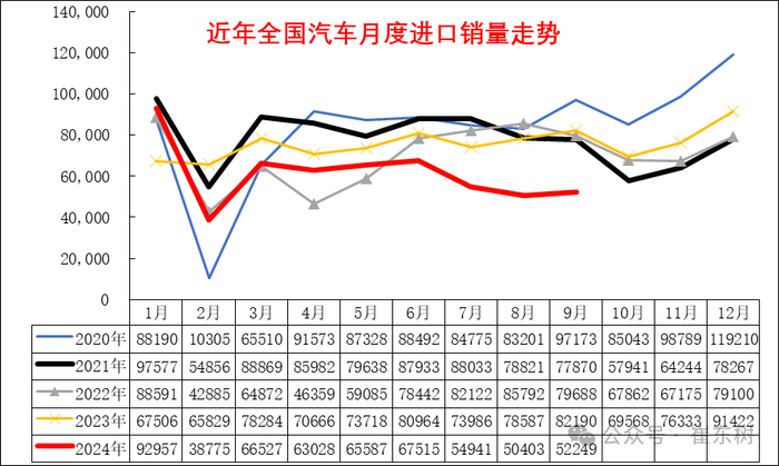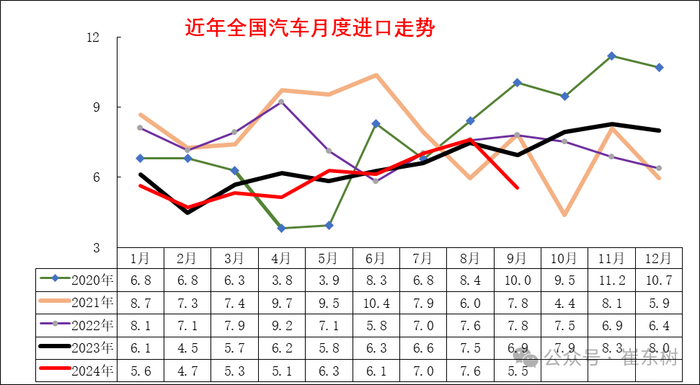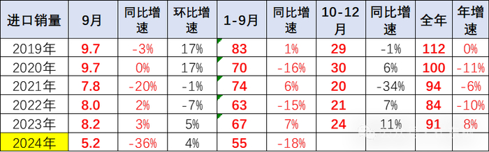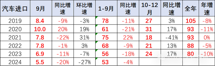 乘联分会秘书长崔东树发文称,中国进口车进口量从2017年的124万台持续以年均8%左右下行,到2023年仅有80万台。2024年1-9月汽车进口53万台,同比下降4%。随着国产车的崛起和国际品牌本土化加速,近几年汽车进口持续低迷,1-9月持续3年负增长。2024年9月进口汽车5.5万台,同比下降20%,环比8月下降27%,这是近期少见的9月巨大下滑。