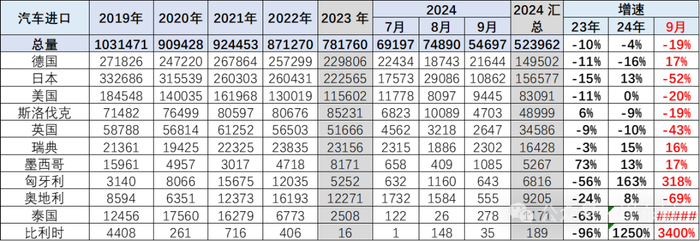 9月德国和瑞典等进口车增量很好。2024年9月进口最高的德国21711辆、日本11006辆、美国9616辆、斯洛伐克4703辆、英国2648辆、瑞典2390辆、墨西哥1085辆、匈牙利643辆、奥地利555辆、泰国288辆。9月同比去年9月增量最大的是德国3182辆、瑞典836辆、匈牙利563辆、墨西哥317辆、泰国285辆。