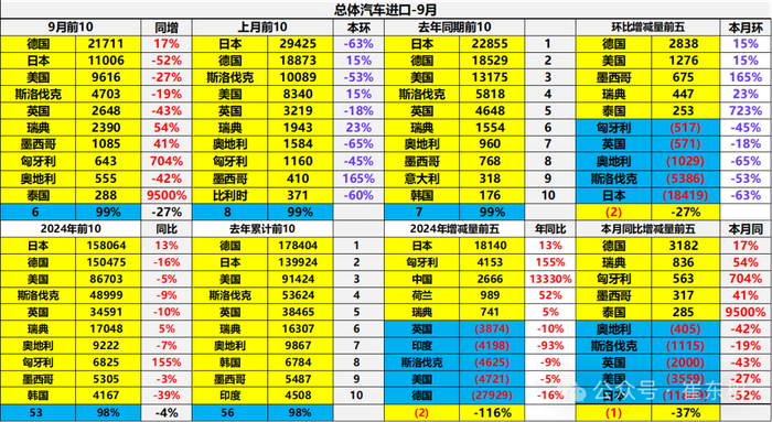 2024年1-9月进口车最高的是日本158064辆、德国150475辆、美国86703辆、斯洛伐克48999辆、英国34591辆、瑞典17048辆、奥地利9222辆、匈牙利6825辆、墨西哥5305辆、韩国4167辆。今年进口增量最大的是日本18140辆、匈牙利4153辆、中国2666辆、荷兰989辆、瑞典741辆。。