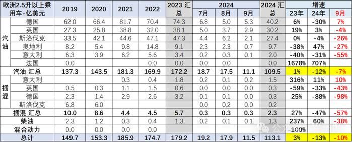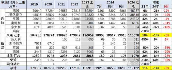 2023年欧洲2.5升以上乘用车对中国出口达到19.6万台,同比增长11%;2024年1-9月达到11.9万台降14%,其中9月1.3万台,降8%。