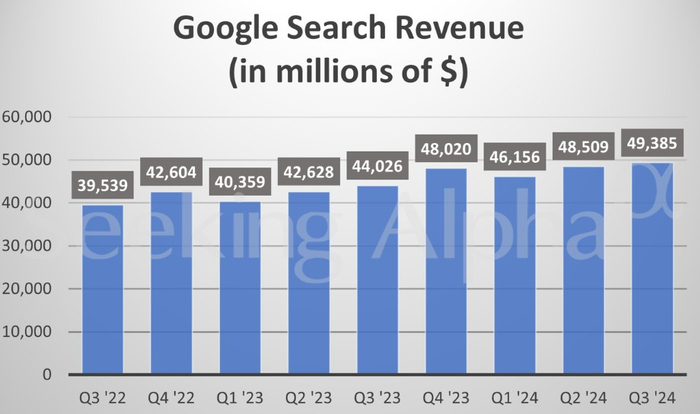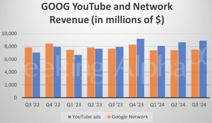 数字广告销售——Alphabet总收入的最大组成部分——从596.5亿美元增至658.5亿美元。其中YouTube的广告销售额增长了12%,达到89.2亿美元,高于预期的88.9亿美元,但较第二季度有所放缓。谷歌仍在数字广告市场的主导地位,帮助吸引了营销资金,尽管TikTok和亚马逊(AMZN.US)正在开拓新的市场。在美国总统大选和8月结束的2024年巴黎奥运会之前,政治支出的增加也提振了季度业绩。
