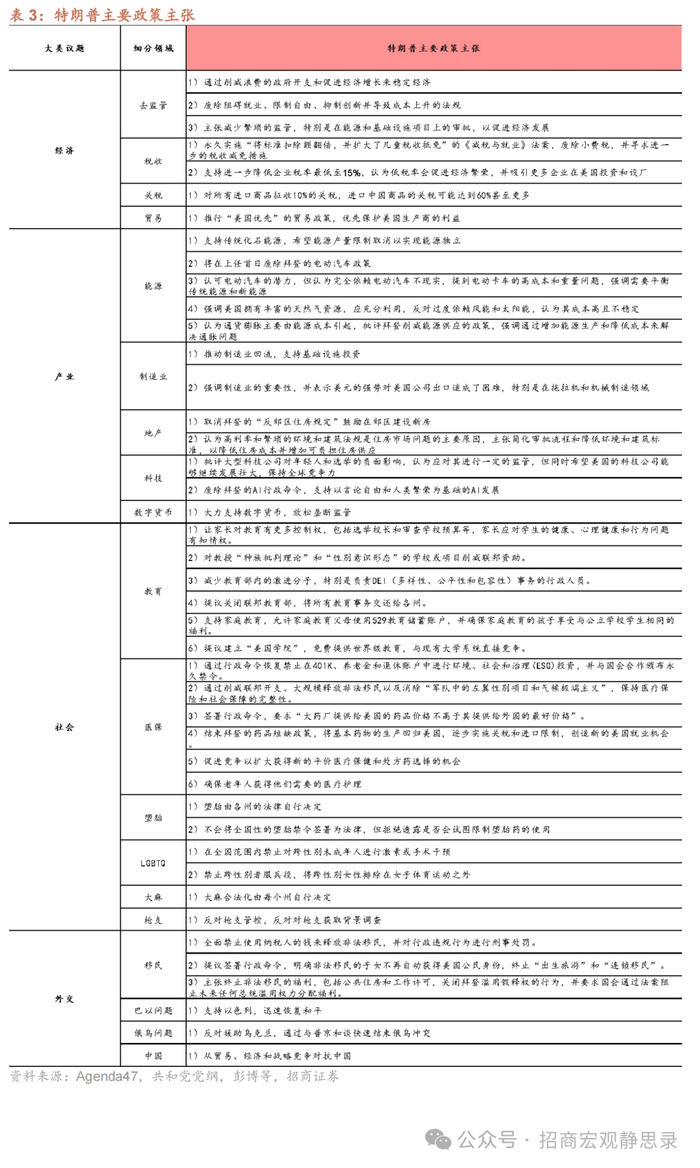 第三,减税政策推出或晚于前两大政策。共和党党纲中指出,随着关税收入的提高,减税政策将顺理成章推进,我们认为这隐含了先加关税后减所得税。上一轮特朗普税改法案将于2025年到期,特朗普曾多次表示要将减税政策永久化,预计特朗普团队可能会先出台新版减税方案,后续国会内部磋商博弈,落地时间可能在2025年底前后。