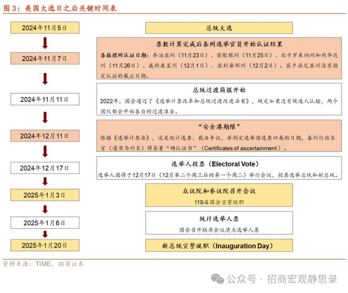 如无意外,未来1-2个月是观察特朗普新政的重要节点。按照正常程序,大选结果确认后(时间未知)特朗普将发表胜选演讲,11-12月也将进入新总统过渡期,特朗普可利用这段时间组建内阁、理顺人事和制度,后续我们将持续跟踪官员提名情况。明年1月3日和1月20日将分别举行国会宣誓就职和新总统宣誓就职,届时特朗普就职演说以及1月下旬到2月上旬可能推出的一系列行政命令也是我们观察特朗普施政方向的重要窗口。