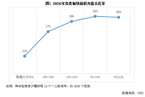 联系各类板块的新房开盘去化率来看,房价跌幅在10%以内板块均在36%左右,明显好于降幅20-30%板块的27%开盘去化率,尤其是高端抗跌板块(降幅<5%),2024年平均开盘去化率高达81%,远高于其他各类板块。