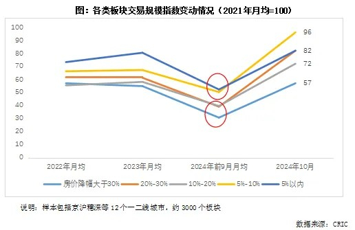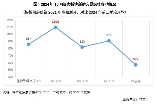 •房价降幅超过10%的板块,2024年前三季度月均交易量仅剩下2021年的不到四成,