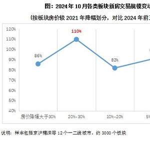 本文缘起于下图,研判2024年10月板块成交结构性动向时,出现了反直觉的数据结论:房价最抗跌1板块的交易量增幅竟然是最小的,反而是房价降幅在20%-30%之间的深跌板块,交易量增幅最大,平均流速较2024年前三季度增长了110%。