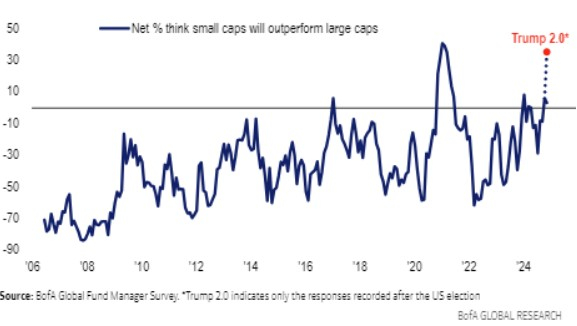 大选后,净35%的基金经理告诉美国银行,他们预计小盘股的表现将优于大盘股,这是自2021年2月以来的最高水平。11月初,净3%的基金经理表示,他们预计小盘股的表现将优于大盘股。
