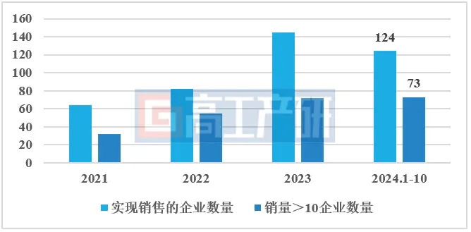 新能源重卡市场潜在空间达千亿级,而当前新能源重卡渗透率不足10%,具备长足发展潜力,是新能源领域优质赛道,近几年市场上不断有新的玩家涌入新能源重卡市场。交强险数据显示,实现销售的新能源重卡企业数量由2021年的64家增长至2024年前10月的124家,几乎实现倍增,其中销量>;10辆的企业数量由32家增长到了73家,市场竞争日趋激烈。