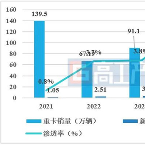 2021-2024年中国新能源重卡渗透率(单位:万辆,%)