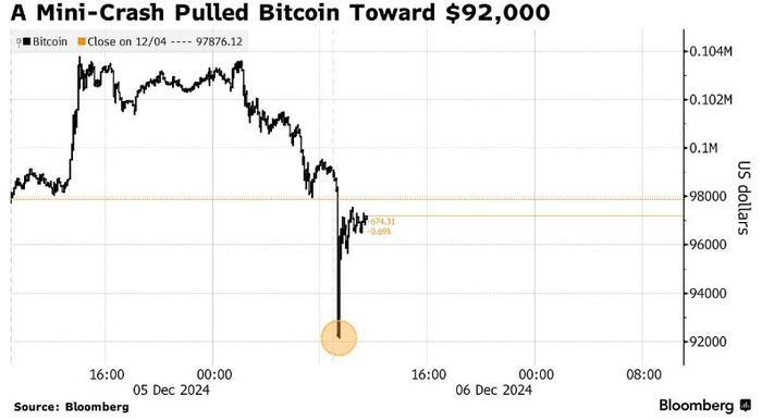 比特币价格在突破10万美元超级大关一度攀升至103,801美元的历史最高位之后,24小时内一度暴跌7%至 92,144 美元,随后有所回暖,目前徘徊在97,300美元附近。