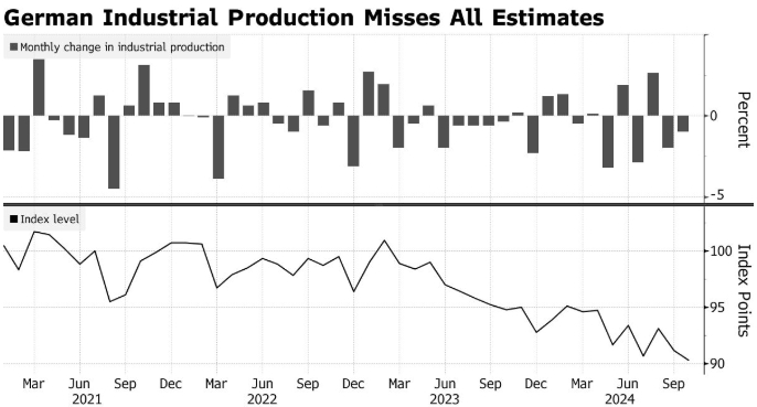 德国10月工业生产意外下降,粉碎了人们对这个欧洲最大经济体的关键部门可能正在缓慢克服萎靡不振的希望。德国10月季调后工业产出环比下降1%,市场预期增长1%。德国统计办公室周五表示,下降主要是由于能源生产,“汽车工业也受到了负面影响”。