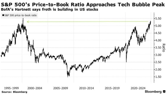 美国银行的迈克尔·哈特内特(Michael Hartnett)表示,美国股市和加密货币的强劲反弹使这些资产类别看起来存在泡沫。标准普尔500指数的市净率在2024年飙升至5.3倍,接近2000年3月科技泡沫高峰期达到的5.5倍的峰值。