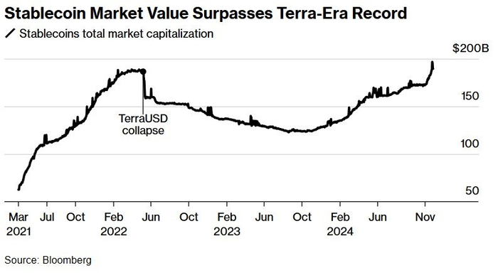 稳定币(Stablecoins)也是一种加密货币,旨在保持价格与法定货币(通常是美元)长期一致。在过去一段时间,它们的主要用途是作为交易员们将资金转入和转出其他加密货币的渠道。但现在越来越多的投资者乐观地认为,随着大力支持加密货币发展的特朗普重返白白宫,稳定币可能将在全球商业以及贸易体系中发挥更重要的作用,特别是作为跨境支付的稳定支付工具。