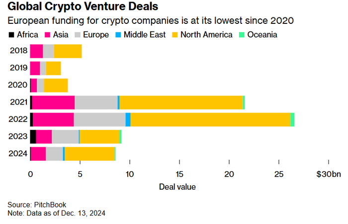 在这种背景下,风险在于欧洲似乎有可能成为“加密货币的死水”。虽然目前尚无关于整个欧洲大陆加密货币交易量的可靠数据,但已有迹象表明情况不容乐观。例如,根据PitchBook的数据,欧洲对加密货币初创企业的风险投资预计有可能将在2024年降至四年来的最低点。相比之下,北美地区已经出现了自美联储2022年加息周期痛击加密货币以来明显的复苏迹象。