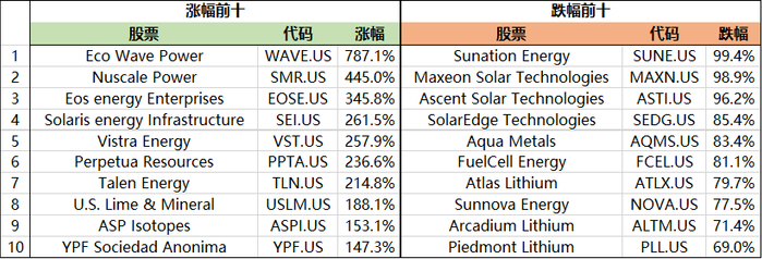 不过,在个股方面,以能源股为主的SPDR能源指数ETF(XLE.US)在2024年结束时上涨2.1%。从涨跌幅来看,2024年能源和自然资源类股涨跌幅前十的股票如下:
