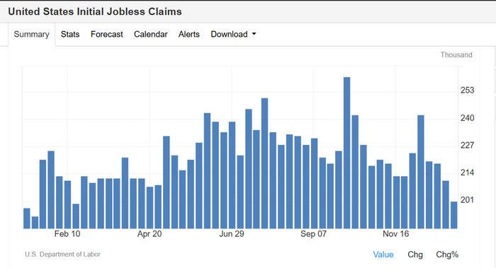 美国劳工部周三公布的数据显示,截至1月4日的一周,美国首次申请失业救济人数下降10,000人,经季节性调整后为大约20.1万人,相比之下经济学家们普遍预期的初请失业金人数为21.8万人。