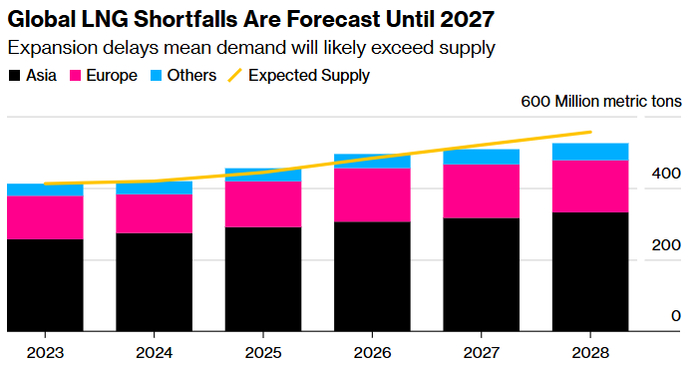 前景在很大程度上取决于新生产设施启动的速度。能源数据公司Kpler的Laura Page表示,去年,由于埃及停止出口,俄罗斯最新的工厂Arctic LNG 2受到美国制裁的扼杀,增长微不足道。