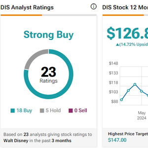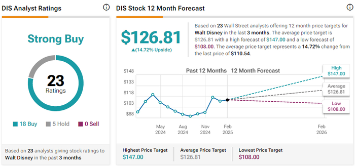 总体而言,华尔街分析师予迪士尼“强力买入”评级,平均目标价为126.81美元,较当前股价水平高出15%。