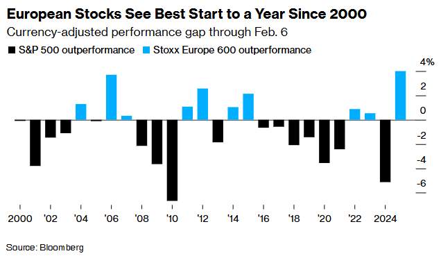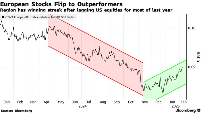 以美元计算,欧洲斯托克600指数年初至今相对标普500指数的表现创下有记录以来最佳开局,部分得益于美国科技巨头的涨势停滞。近年来,由美国大型科技股推动的美股持续跑赢欧股,过去五年总回报率约为欧洲指数的两倍,累计涨幅近100%。
