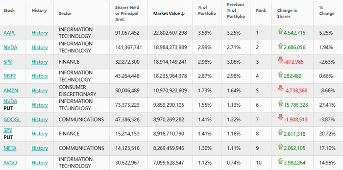 在前五大重仓标的中,苹果(AAPL.US)位列第一,持仓约9105.7万股,持仓市值约228.03亿美元,占投资组合比例为3.59%,较上季度持仓数量增加了5.25%;