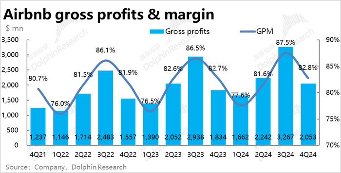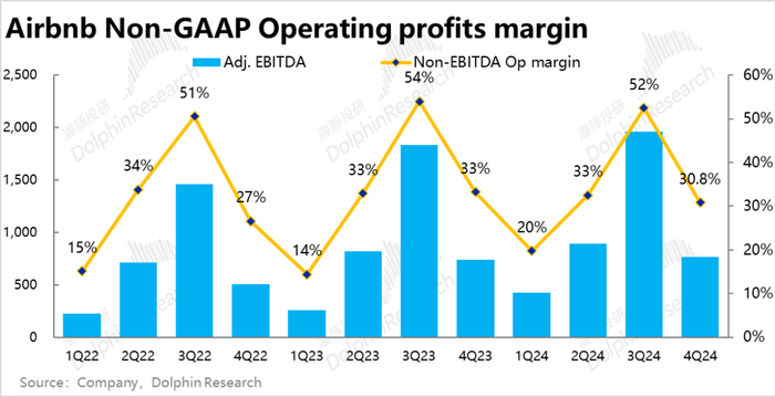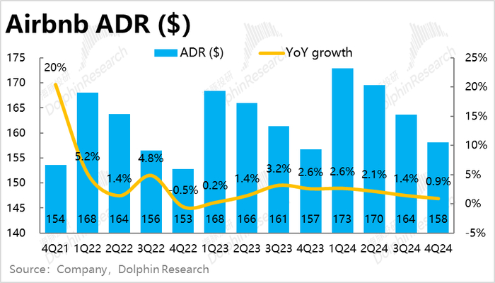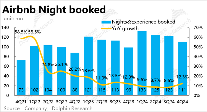 主要是本季总间夜预定量同比增速从上季度的8.5%大幅拉升到了12.3%,整整加速了3.8pct,也远高于市场预期9.6%的增速。据海豚投研的了解,AirDNA等高频数据确实指向4Q相比3Q的预订量会加速增长约2.5pct,可以说增长环比加速市场是有预期的,但实际加速幅度还要更高。