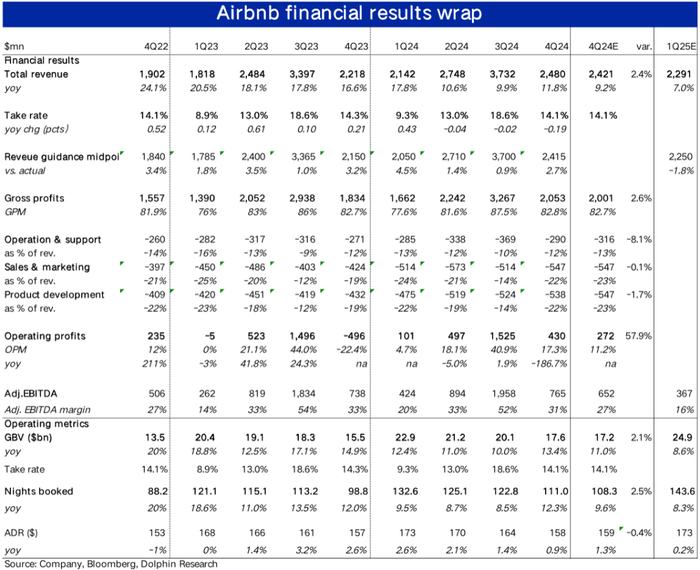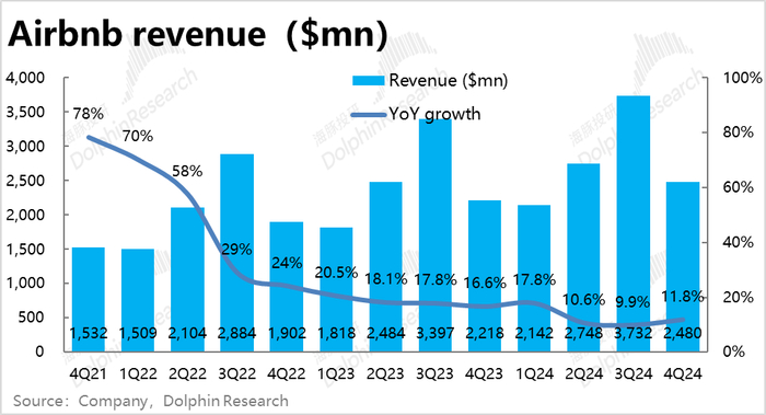 营收角度,由于底层经营数据超预期的强劲增长,本季Airbnb确认收入$24.8亿,同比增长11.8%,同样环比加速增长,且明显好于预期的9.2%的增速。