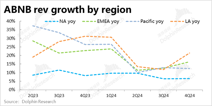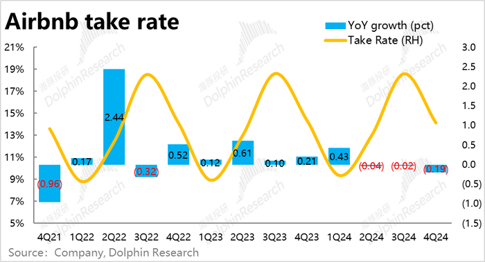 3、本季Airbnb确认收入$24.8亿,同比增长11.8%,同样环比加速增长,且明显好于预期的9.2%的增速。不过,本季的变现率同比微降了19bps,连续三个季度Take rate同比下降。据公司解释,变现率略微下降是由于去年同期公司一次性将未使用的gift card记入了收入。我们猜测营收地区结构的改变(往拉美和亚太地区的倾斜)也可能对take rate产生了一定的拖累。