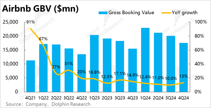 最核心的经营指标—Airbnb的总预定金额(GBV)本季达$175.5亿,同比增长了13.4%,较上季度提速了整整3.4pct,显著高于市场预期的11%。这个信号的关键意义是,市场对Airbnb的最大担忧之一就在于预订增长的不断放缓,甚至有滑向个位数增长的风险。本次的表现可能标志着公司进入再加速,至少不再持续下滑的信号灯。