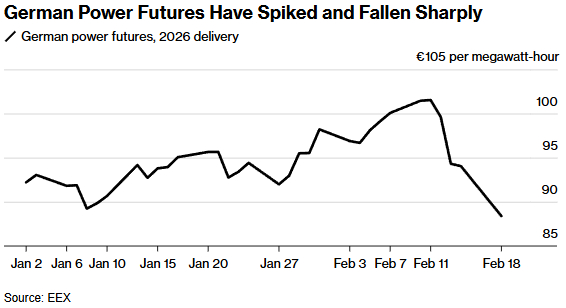 欧洲能源交易所(European Energy Exchange)的数据显示,自上周达到峰值以来,德国2026年电力期货已下跌约14%。这主要是由于对美国斡旋的结束乌克兰战争谈判的猜测,以及对燃料供应的潜在影响,导致天然气价格暴跌。