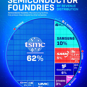 根据Visual Capitalist的统计数据,2024年全球晶圆代工行业总收入达到了1317亿美元,其中仅台积电一家便占据了62%的市场份额,加上联华电子、VIS和PSMC等其他台湾公司的贡献,台湾整体份额超过70%,继续稳居全球半导体制造的核心地位。紧随其后的是韩国,不过三星代工市场份额从2019年的16%下降到了2024年的10%,足见三星在代工领域的挑战。美国的GlobalFoundries和英特尔代工服务(IFS)合计占据6%。以色列的Tower semiconductor占1%。值得注意的是,2024年大陆晶圆厂在市场份额上持续增长,中芯国际占据了5%,华虹占据了2%,晶合集成占据了1%,合计拿下8%的市场份额,而且增长势头强劲。