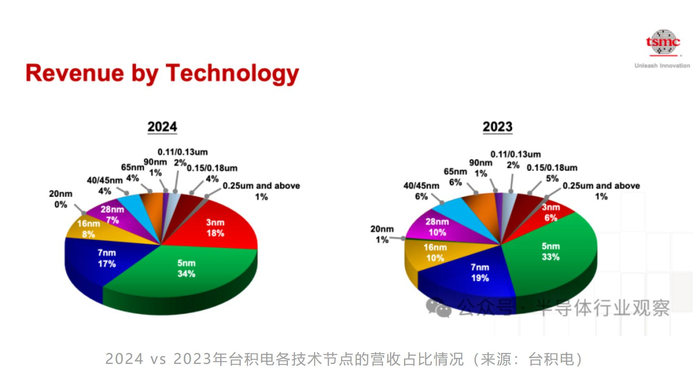 从台积电的各工艺节点的收入占比来看,才量产没几年的3纳米工艺在2024年就贡献了台积电18%的晶圆收入,5纳米占比为34%,7纳米占17%。先进技术(包括3纳米及以上工艺)占总收入的69%,较2023年58%的占比有所提升。