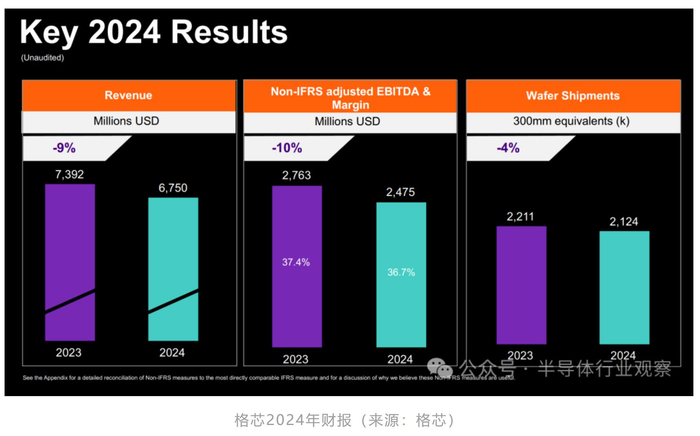 作为同专注于成熟节点的格芯而言,挑战同样不容忽视。格芯2024年收入预计为67.50亿美元,同比下降9%;毛利率为24.5%,净亏损2.62亿美元,远低于2023年10.18亿美元的净收入。展望2025年第一季度,格芯预计收入将在15.5亿至16亿美元之间,毛利率预期为22.1%。