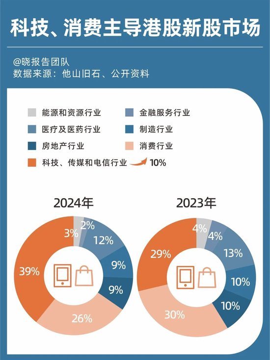 历史而言,消费和科技股主导港交所新股市场是常态。不过,2024年,港股科技股占比相比2023年增加了10%达到了39%,此消彼长下,消费股占比有所下降。