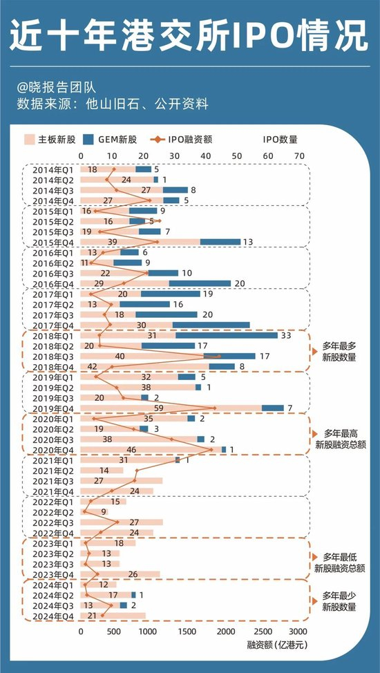 值得一提的是,如今也属于港交所十年来的IPO“淡季”。尽管2024年的融资金额相比2023年有大幅的提升,但整体尤其新股数量,相比往年还是处于一个比较低的水平,这意味着未来的市场吸引力和活力仍十分有限。