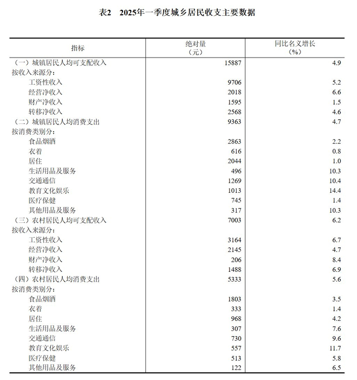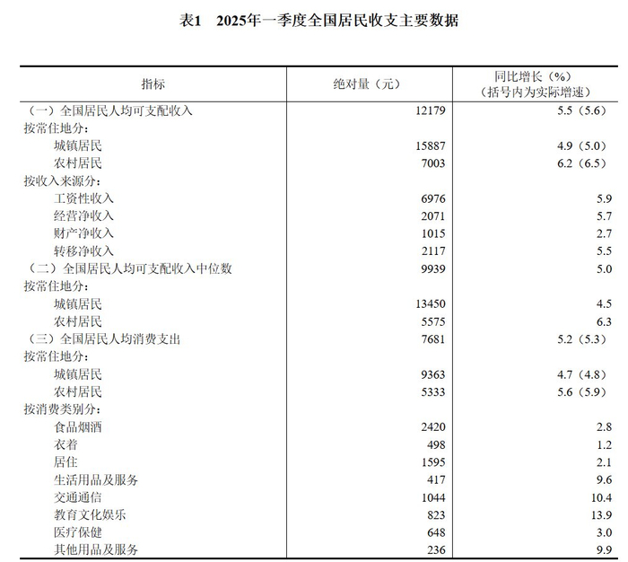 2025年一季度居民收入和消费支出情况