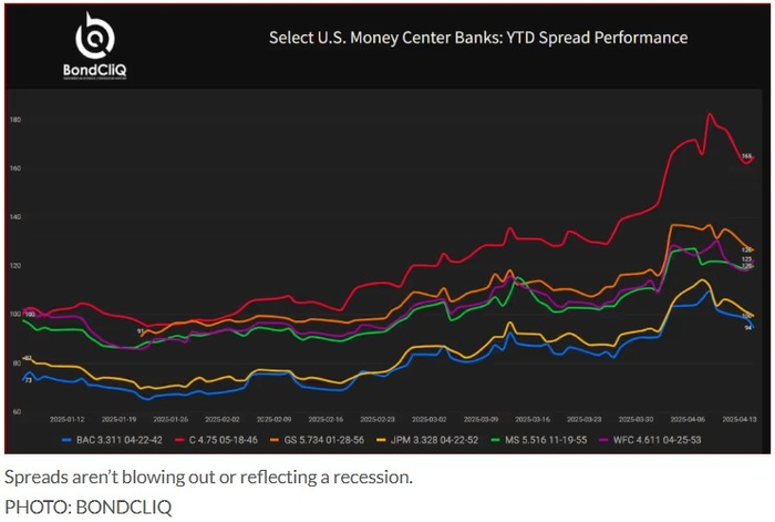 与此同时,尽管花旗、摩根大通、高盛等大型银行所发行的公司债利差有所上升,但并未出现明显的违约担忧,亦未反映出严重的衰退风险。