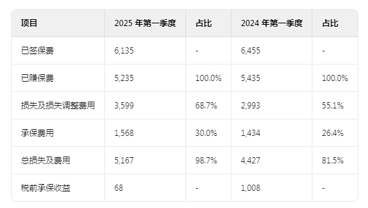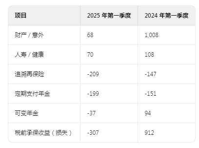 2025 年第一季度,已签保费较 2024 年下降 3.2 亿美元(5.0%),主要归因于财产保险业务量的减少。已赚保费较 2024 年第一季度下降 3.7%。