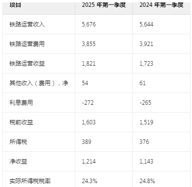 2025 年第一季度,铁路运营收入较 2024 年略有增加,主要是由于单位运输量增加 4.1% 和核心定价上涨,但部分被每辆车 / 单位平均收入下降(由于燃油附加费收入减少和业务组合不利)所抵消。税前收益较 2024 年第一季度增长 5.5%。