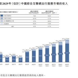 预计至2029年,中国综合互联网出行服务市场的收入将达到人民币1.7万亿元,2024年至2029年的复合年增长率为11.7%。其中,中国在线交通预订市场的收入预计将达到人民币1.4万亿元,2024年至2029年的复合年增长率为10.6%。