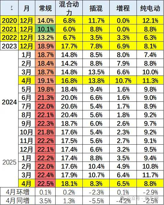 2025年4月的新能源车的促销降到9.4%的低位,较同期大幅下降。近几个月的促销加大,随着降价的温和,促销体系优势显现,目前已达到正常促销水平的高位。