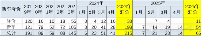 2025年截止到4月的降价车型总体不多,主要是新能源车,集中在2-4月。燃油车1月较多,4月较少,仍属正常。